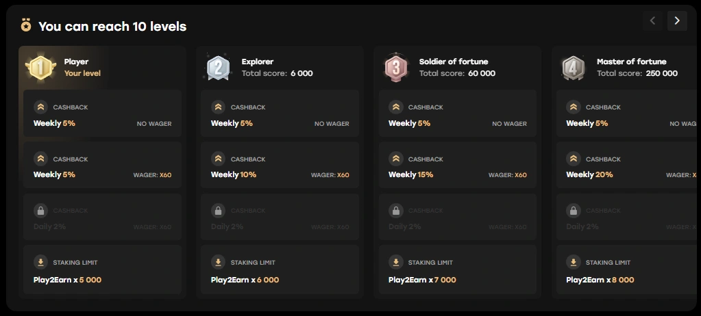 This system of loyalty levels motivates players toward active participation and constant improvement of their status on the platform.